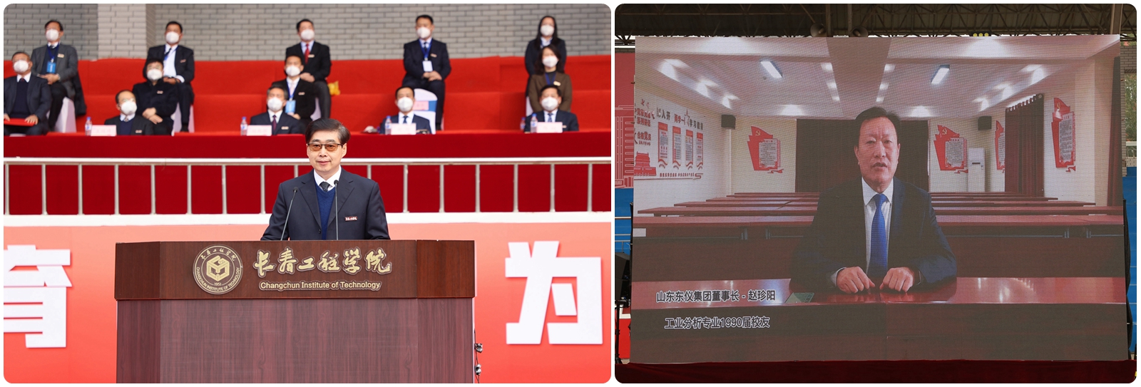 勘查与测绘工程学院吴景华教授,山东东仪光电仪器有限公司、烟台东方分析仪器有限公司董事长赵珍阳,电气与信息工程学院电气2241班学生家长宋刚,计算机技术与工程学院计算1942班学生张瑶琳分别代表全体教师、优秀校友、新生家长、全体在校生进行了发言。