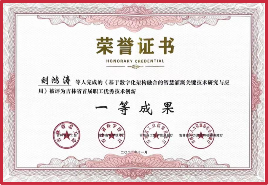 为加快推动创新型省份和人才强省建设,激发职工劳动热情和创造潜能,加快建设宏大的知识型、技能型、创新型产业工人大军,近日,由吉林省总工会、吉林省科学技术厅、吉林省工业和信息化厅、吉林省人力资源和社会保障厅联合开展的助力新时代东北全面振兴——大国工匠吉林行暨吉林省首届职工创新交流(交易)大会在长春市国际会展中心举行。本次活动评选出首届吉林省职工优秀技术创新成果奖,我校水利与环境工程学院刘鸿涛教授科研团队完成的《基于数字化架构融合的智慧灌溉关键技术研究与应用》被评为吉林省首届职工优秀技术创新成果一等奖。