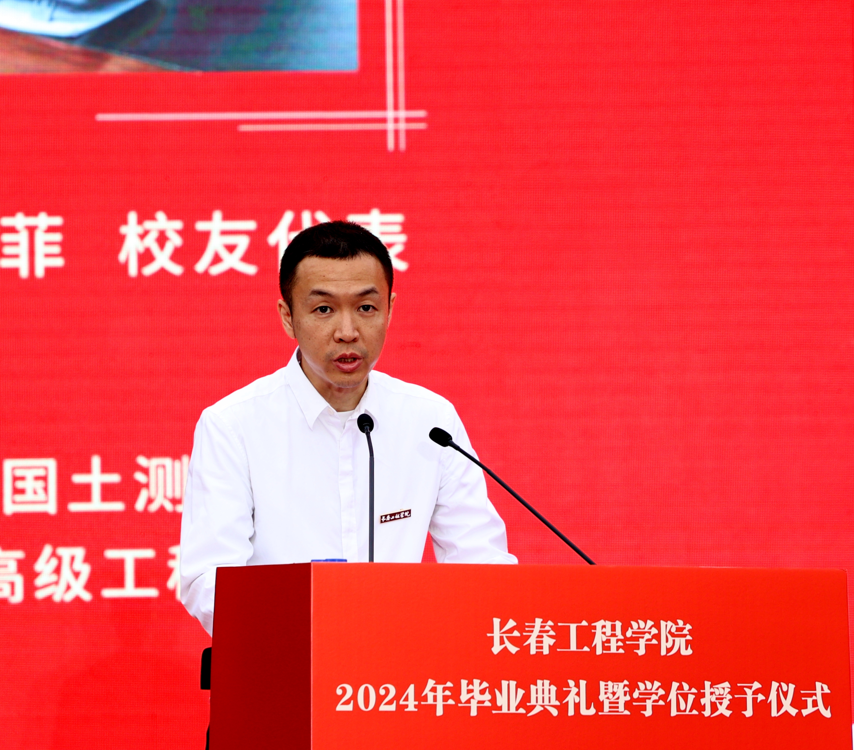 长春市国土测绘院院长、2009届勘查与测绘工程学院毕业生徐菲作为优秀校友代表发言,他分享了个人的工作经历,并对母校在他成长成才路上的深远影响与帮助表示感激。