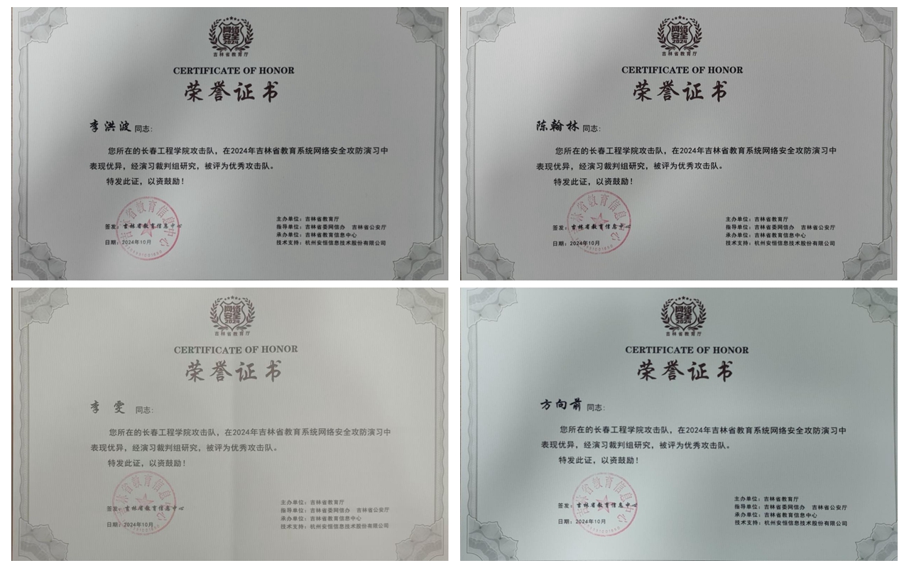 近日,在2024年全省教育系统网络安全攻防演习中,我校参赛团队在27支攻击队伍中顽强作战,表现优异,获评“2024年吉林省教育系统网络安全攻防演习优秀攻击队”荣誉。