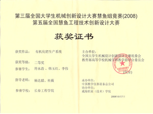 2008年9月4日至7日,在山东威海举行的第三届全国大学生机械创新设计大赛慧鱼组竞赛暨第五届全国慧鱼工程技术创新设计大赛中,由我校机电学院教师杨达毅、杜微指导,符永浩、韩玉红和李伟三名同学制作的“有机化肥生产系统”,在参加此次大赛中的59个参赛队伍中脱颖而出,喜获全国二等奖。
