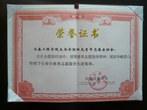 特别是在“为了美善,献出一片爱”大型募捐活动中,我们的志愿者不畏严寒,在校园﹑在大街上,奉献我们的爱心,让爱的火焰继续燃烧,发出爱的光芒,为需要帮助的人带来希望,也展现了我们志愿者的踊跃奉献爱心的服务精神;同时也受到了社会各界人士的一致好评。长春市慈善总会得知这一消息,也深受感动;为此特授予了土木学院阳光志愿者协会“志愿服务先进集体”荣誉称号。