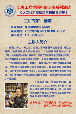 为推进我校省社科基金项目的申报组织工作,提高学院项目申报数量及质量,2023年3月20日晚18:00—20:00,外国语学院联合科学研究处、科学秘书处,邀请山东大学杨港博士,举办了《人文社科类项目申报辅导讲座》。讲座主要围绕吉林省哲学社会科学规划项目书的设计和撰写展开,专家对已经提交到学院的7个项目申请书进行了系统的点评和悉心的指导,40余位教师参加了此次辅导。
