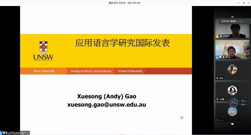 为提升教师的学术论文撰写水平和科研能力,5月31日上午9:00至11:00,外国语学院邀请澳大利亚新南威尔士大学教育学院博士生导师、国际应用语言学权威期刊System(SSCI一区刊物)联合主编高雪松副教授作了一场题为“应用语言学研究国际发表”的学术报告,报告以腾讯视频会议的形式进行。外国语学院科研教师参加了此次讲座,来自全国各地高校的268位外语同行也参加了此次学习。