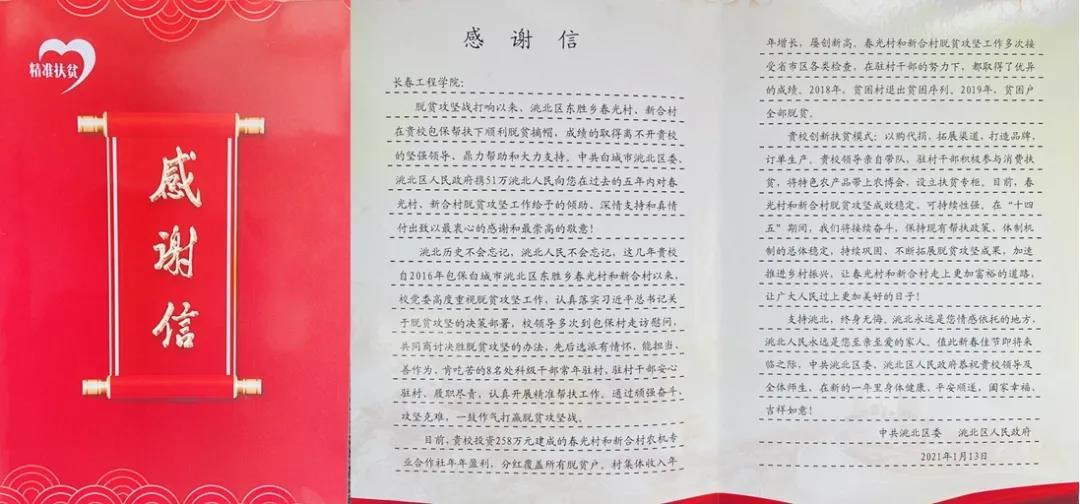 2021年,中共洮北区委、洮北区人民政府又给星空官方网站_星空xingkong(中国)发来了感谢信。“有情怀、能担当、善作为、肯吃苦”,信中这样形容星空官方网站_星空xingkong(中国)的驻村干部;“洮北永远是您情感依托的地方,洮北人民永远是您至亲至爱的家人”,信中这样形容双方的帮扶关系。